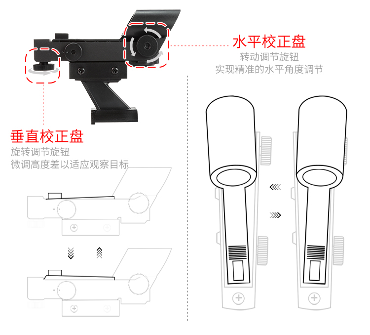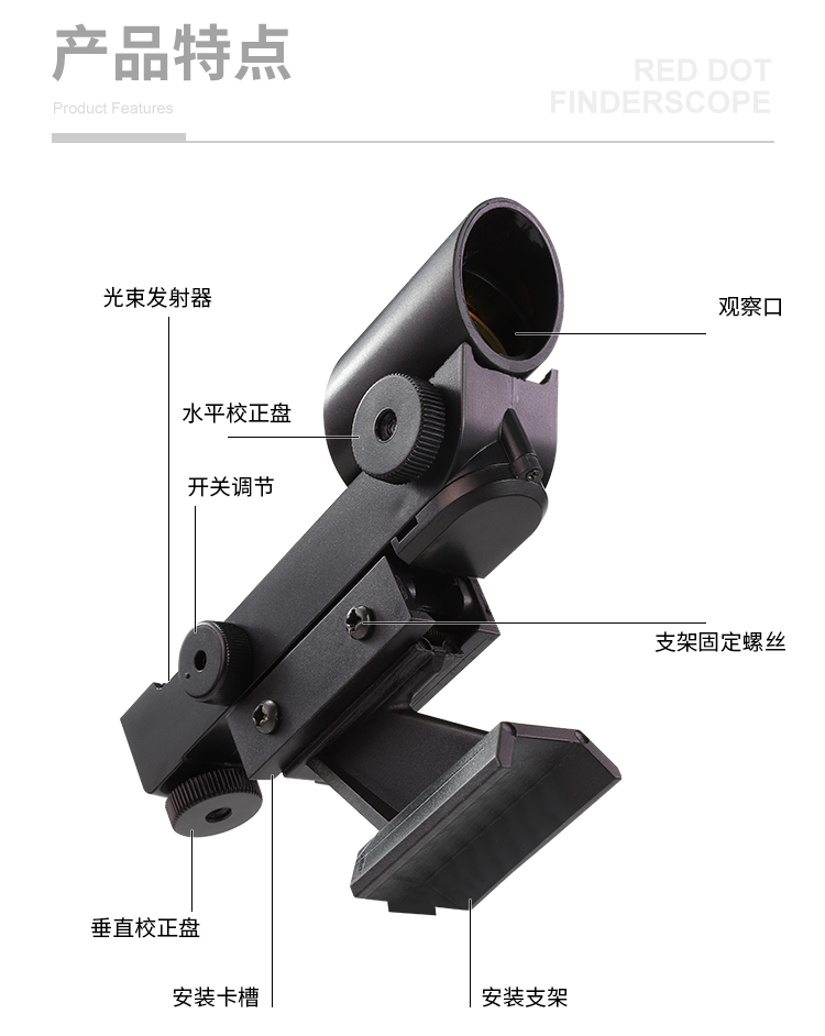 多功能调节设计:具备精密的上下、左右调节旋钮,方便用户将红点与望远镜主镜的光轴精确校准。同时支持光线强弱调节功能,以适应不同环境的光照条件。