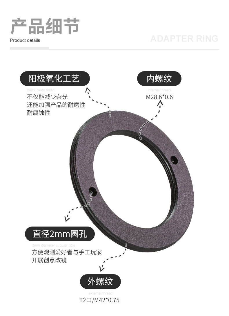 • 作为望远镜调焦器或滤镜轮中的关键连接部件,适配环确保相机传感器处于理想位置,实现精准对焦与平坦视场。从安装到拍摄,全程稳定可靠,助力每一次天文观测任务。