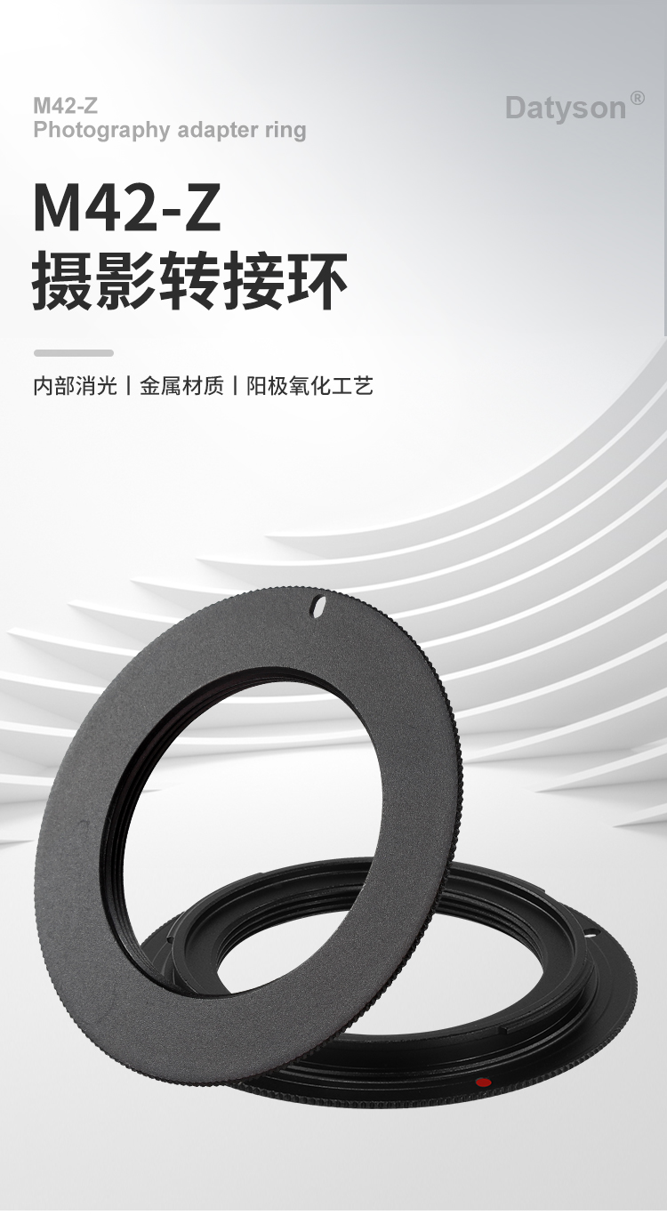 Datyson 摄影转接环 B5P9843Z 是一款专为摄影爱好者及专业摄影师设计的高品质镜头转接环,主要用于将 M42×1mm 外螺纹(常见于老式螺口镜头,如苏联镜头、蔡司、潘太康等) 的镜头,转换安装到尼康相机的 Z 母口 上使用。