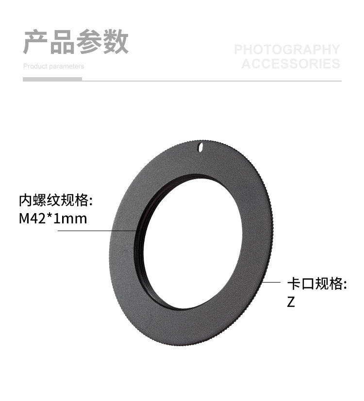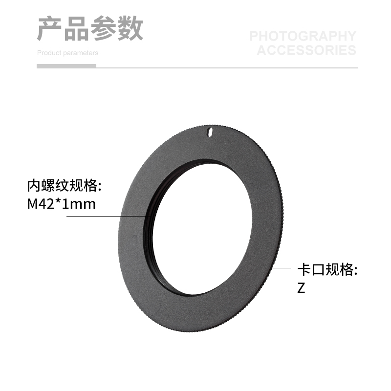 产地:中国广东省揭阳市螺纹:M42*1mm内螺纹卡口:尼康Z卡口材质:金属-铝颜色:黑色