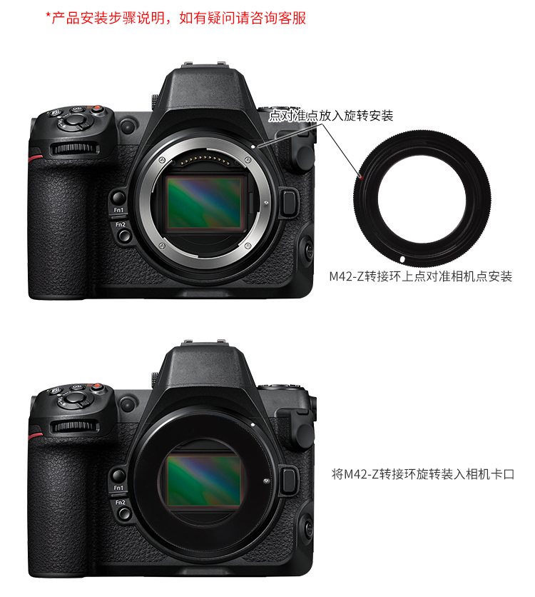 安装时请确保镜头与转接环、转接环与相机卡口之间紧密连接,防止虚焦或进灰;