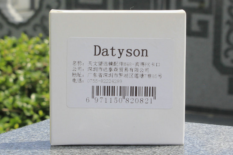 品牌:Datyson产品编号:5P9959产地:中国广东省揭阳市材质:铝合金螺纹:M48*0.75mm卡口:宾得PK卡口颜色:黑色商品条形码:6971150820821转接环 1个